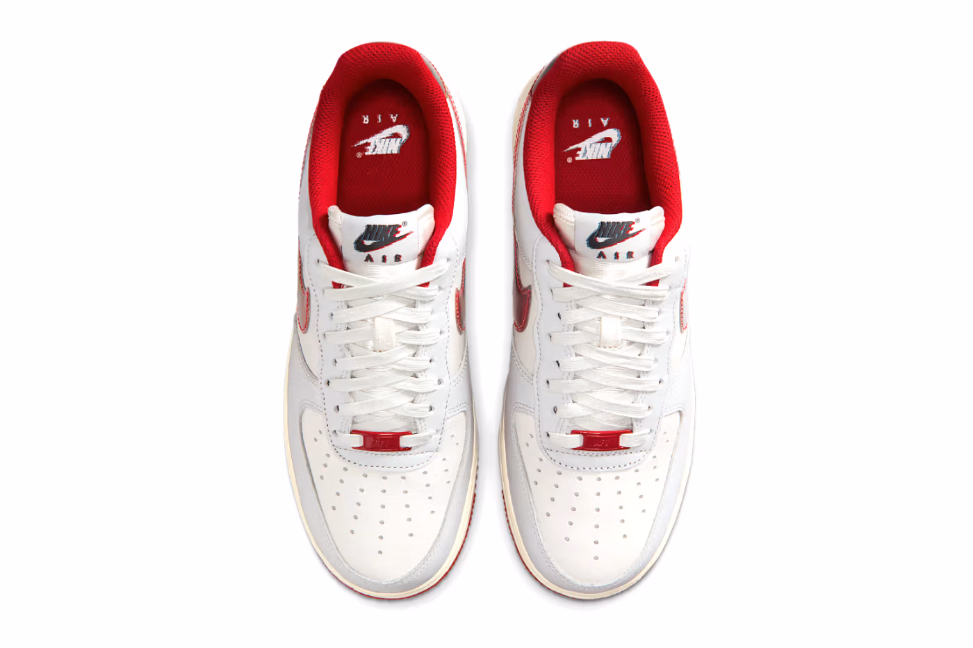 Finishing details include a beige midsole with a black AIR logo, a red outsole, and white laces with red AF1 dubraes.